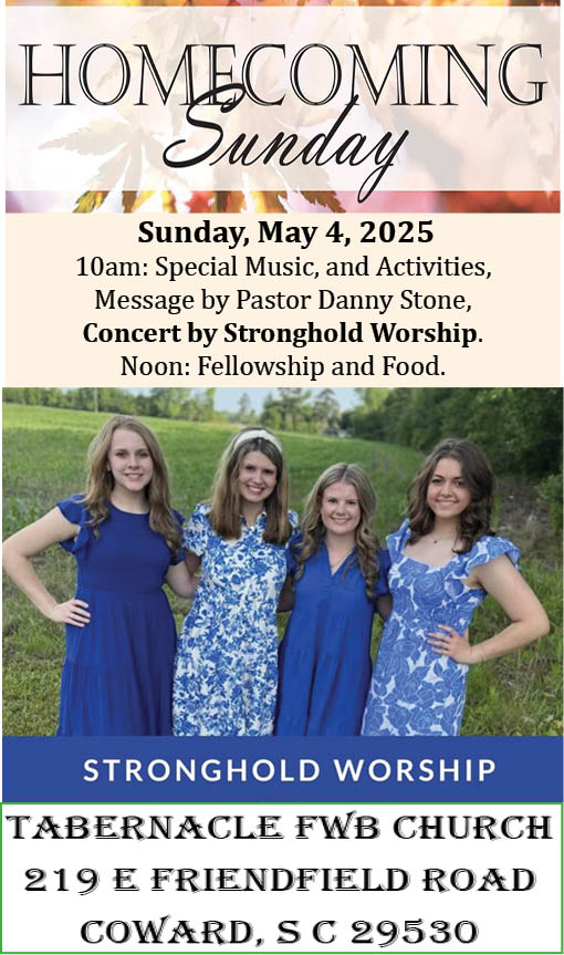 Welcome to Tabernacle Free Will Baptist Church! Our church is located at 219 East Friendfield Road in Coward, South Carolina. If you would like to join us for a service, we offer worship services at 11:00 am and 6:00 each Sunday. Sunday school classes begin at 10:00, but be sure to come a little early for a free cup of coffee! Our Wednesday night Bible study begins at 7:00 pm.